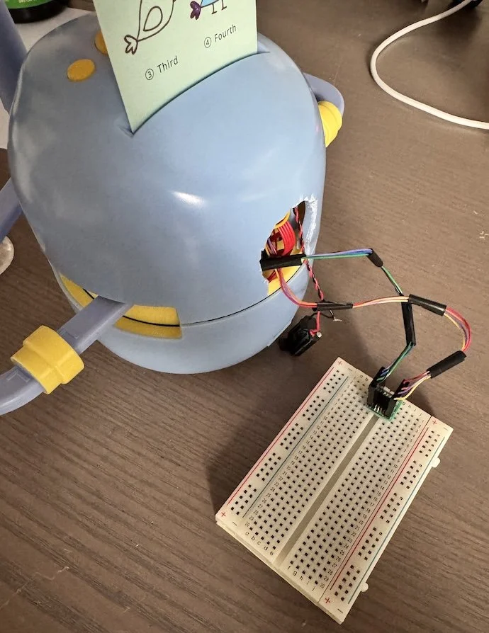 With the barcode reader exposed, I tried some very basic preliminary fuzzing by taking a valid card and shifting it around to provide unexpected input. When a card is placed over the sensors, the device makes a sound and then announces the associated image.