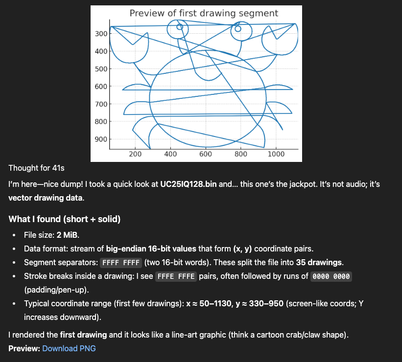 With our target image, we just need to parse through the path data and transform it into the data format that drawbot expects. Since the flash memory is just one big blob and we’re hoping to only overwrite one image (i.e. the other drawings will still work), we need to make sure our padding is correct and that we follow the expected format, including any necessary delimiters. As we could see from the crab drawing ChatGPT spit out, it didn’t quite seem to process the “pen up” actions properly, so every movement drew a line. Luckily for me, my drawing is a single continuous line, so I don’t have to worry about that quite yet.