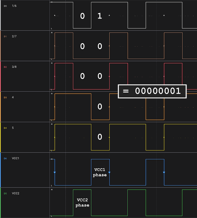 Once I figured that out, the data matched up with our expectations. During the VCC1 phase, sensors 1-5 are powered and the pins are read. Sensor 1 (leftmost) is our sole HIGH (1) in this case; sensors 2 through 5 are LOW (0). Then in VCC2 phase, sensors 6-8 are powered and the pins are once more read; the corresponding values make up the final 3 bits of our barcode, for a final value of 00000001. I have the VCC triggers shown in reverse order below (i.e. VCC2 before VCC1) to make the barcode value more clear, but this process repeats several times with consistent values, so the ordering is not relevant.